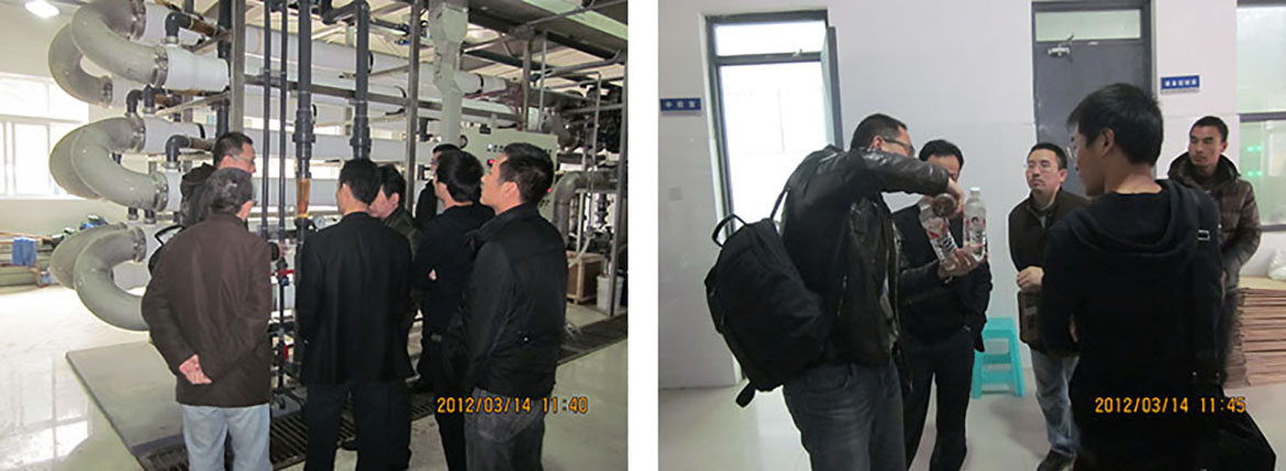象山考察團邊參觀邊提出了自己的問題和看法,劉經理和王經理非常全面的解答了他們的問題,并向他們展示了分別經過超濾、納濾、反滲透三套裝置處理后的水樣進行對比,從外觀顏色就可以明顯的看出處理效果,超濾產水顏色略黃,納濾、反滲透產水清澈透明,王經理詳細的解釋了三種膜的不同結構和處理原理,象山考察團對三套裝置的處理效果非常滿意,肯定了這一高新技術,計劃對象山水桶岙垃圾場的滲濾液處理站進行改造,投資增加安裝膜系統,以使滲濾液處理更有效的達到排放標準,對方也期望我公司在投資成本上給予優惠。