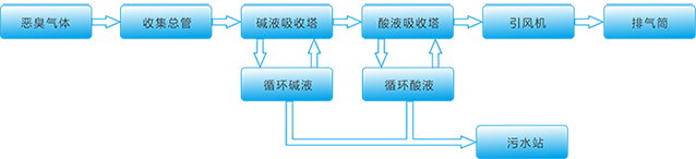 本技術針對的是污水處理站的惡臭氣體,污水處理站的惡臭氣體主要來源于進水格柵、嚗氣沉沙池、初沉池、污泥脫水間、污泥沉淀池等;主要成分有氨氣、硫化氫和甲硫醇等無機物。根據污水處理站惡臭氣體的成分和特性,采用化學吸收法,使用螺旋噴霧填料裝置治理此類惡臭氣體,其治理效率極高。